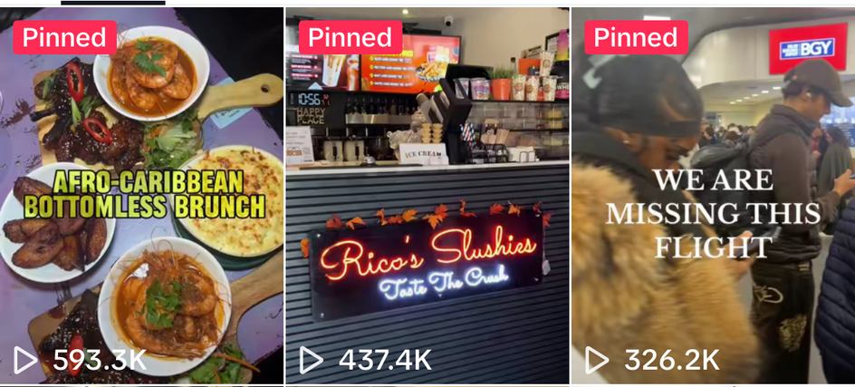 Rico’s Slushies (436K views), Missed Flight (326K views), and Chagos Bar (591K views)